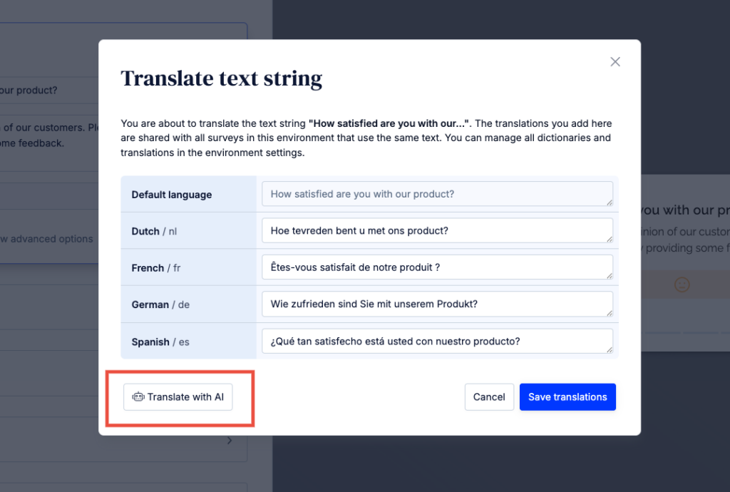 The AI translation feature is available both in the Translation Hub and directly within the survey editor while creating or editing a survey.
