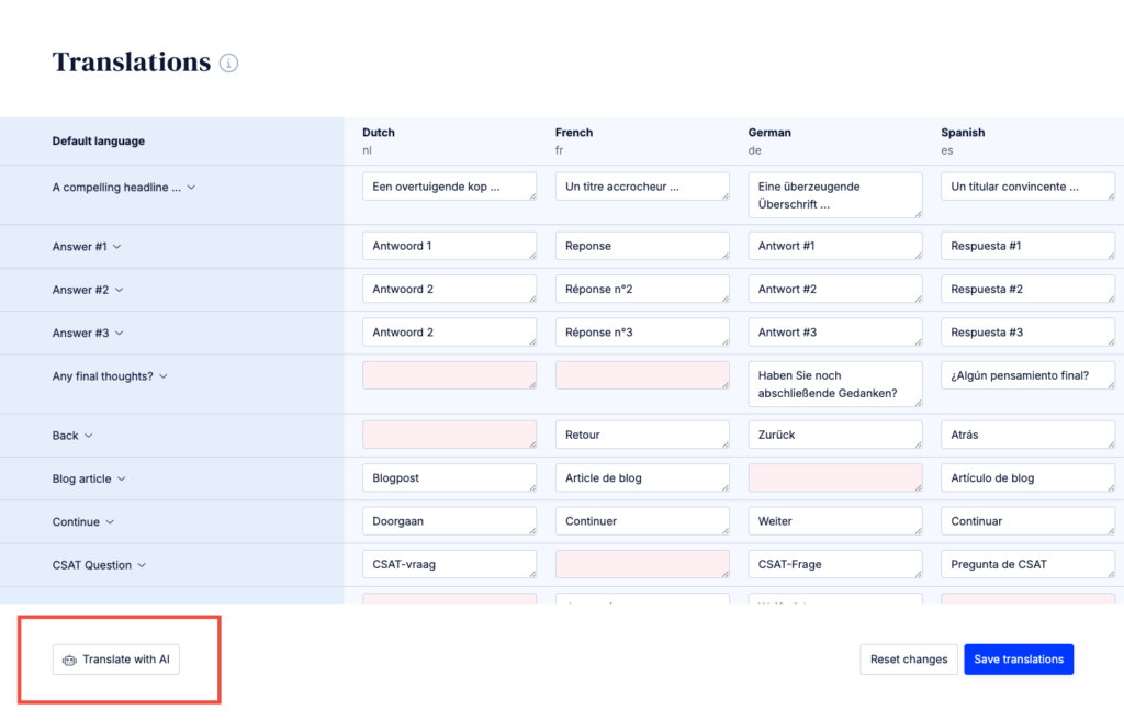Please note: The multi-language translation system described on this page is only accessible for customers on a Growth or Enterprise plan at the moment. Please contact us if you want to use it on a different subscription plan. As an alternative, you can also simply duplicate a survey for each language and translate all text items.