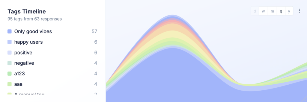 The Tag Timeline chart visualizes how often response tags are applied over time. It helps you understand trends in qualitative feedback by showing whether certain themes, topics, or sentiments are becoming more or less frequent in survey responses.