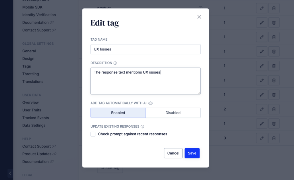 Once enabled, Refiner AI will review each incoming survey response and apply the tag whenever the description you provided is true for that response. Tag descriptions can be quite short, and we recommend experimenting with different phrasings to get the best results.