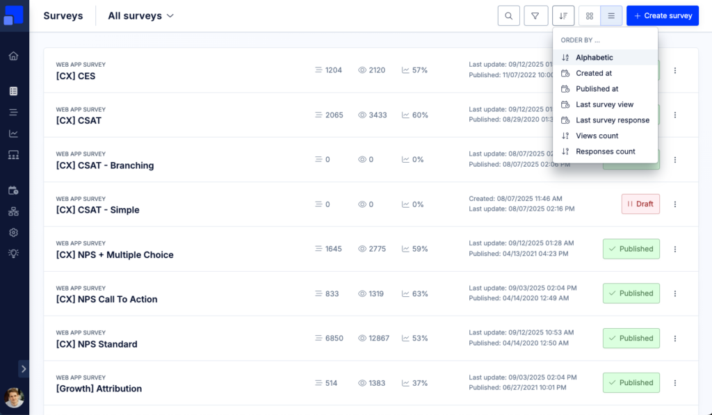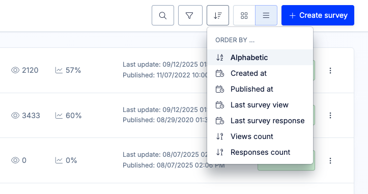You can also sort surveys by their name (default), the creation date, the publication date, the last survey response date, as well as their response count.