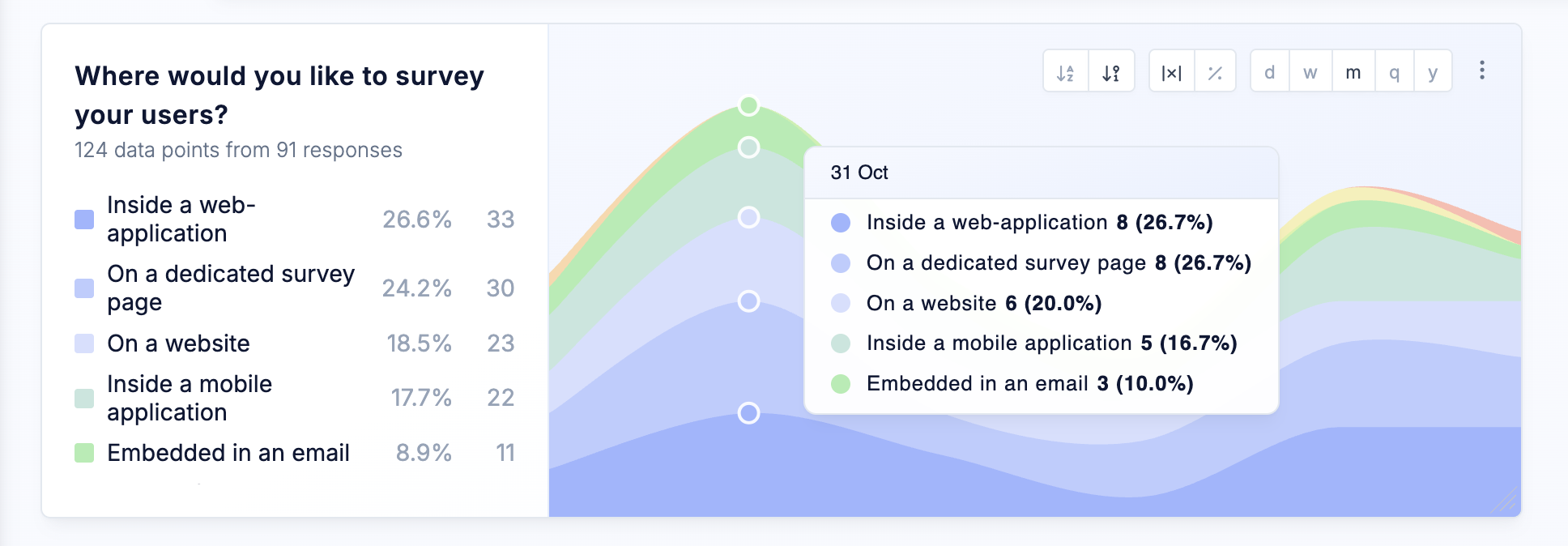 We’ve introduced the new Distribution Trend Chart to help you better understand how survey responses evolve over time. Instead of focusing on a single metric, the chart visualizes the full distribution of responses as colored areas across a timeline, making shifts in user sentiment immediately visible.